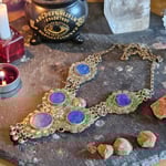 This one-of-a-kind necklace was handcrafted as a multi-point working talisman, designed to hold, direct, and stabilize magickal force across the body’s energetic field. This piece was specifically created and crafted for a working magickal collection where it was employed for over 30 years!