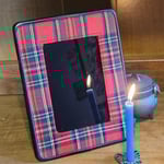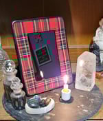This black mirror is crafted from a lovely frame with a wonderful plaid material with leather (like) trim. It has a perfectly black reflective glass to enhance focal aspects during sessions.