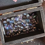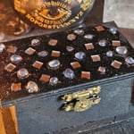 Crafted by me during full ritual with love and intention, this one-of-a-kind manifestation box is a small but powerful. Painted in soft black lineage herb steeped ink-paint and adorned with aura quartz crystal chips and mirrors sealed in resin for longevity.
