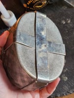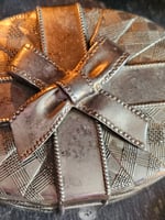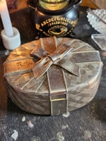 This is a beautiful Vintage heavy metal box with a great wrapped bow design. It comes from a working magickal collection where it has been employed over the last 22 years.