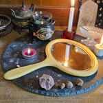 The Vintage hand held mirror has been worked through a minimum of three lunar cycles within personal lineage rituals using three different modalities of imbuing and preparation and comes with a candle imbued for connection to spirit and universal energy flow.