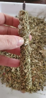 The candles are made with six interwoven candles, herbs, resins, and pure beeswax. The colored interior candle is dressed and wrapped. This is a powerful method of candle magick spell casting.