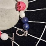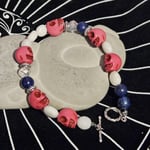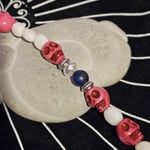 This unique bracelet was made by me during ritual with spirit guidance. Created from pink skulls, white jade, lapis, and sparkling beads.