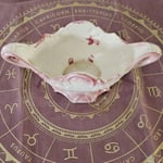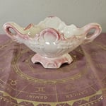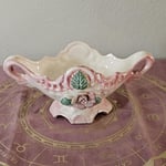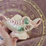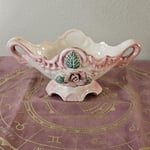 Romantic and refined, this vintage ceramic altar bowl brings soft elegance and divine feminine energy into your sacred space. With its delicate pink-and-cream glaze, sculpted roses and leaves, and ornate twin-handle design, it's the perfect centerpiece for altar work or spiritual decor.